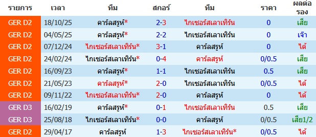 ไกเซอร์สเลาเทิร์น เตรียมเปิดสนาม Fritz Walter Stadion ต้อนรับการมาเยือนของทีม คาร์ลสรูห์ โดยเจ้าบ้าน ไกเซอร์สเลาเทิร์น ของกุนซือ ทอร์สเทน ลีเบอร์เน็คท์ เพิ่งจะพลาดท่าพ่าย โบคุ่ม 2-3 มาอย่างน่าเสียดาย ทำให้พวกเขาแพ้รวดมา 2 นัดติดต่อกัน อย่างไรก็ตาม สถิติการเล่นในบ้านของพวกเขายังถือว่าแข็งแกร่ง (ชนะ 8 เสมอ 1 แพ้ 4) และปัจจุบันรั้งอันดับ 7 ของตาราง โดยมีเป้าหมายคือการเก็บ 3 แต้มเพื่อทิ้งห่างคู่แข่งร่วมรัฐและรักษาพื้นที่หัวตารางต่อไป สภาพความพร้อม จะขาด อีวาน พรตายิน ที่เจ็บเอ็นร้อยหวายต้องพักยาว รวมถึงผู้รักษาประตูสำรอง อัฟโด สปาอิช ที่ยังเจ็บข้อเท้า ทางฝั่ง คาร์ลสรูห์ ของกุนซือ คริสเตียน ไอช์เนอร์ รั้งอันดับ 8 ตามหลังเจ้าถิ่นเพียง 3 คะแนน ล่าสุดเพิ่งโชว์หัวใจสู้ไล่ตามตีเสมอ ดินาโม เดรสเดน 3-3 ได้ในช่วงทดเวลาบาดเจ็บ จุดเด่นของพวกเขาคือเกมรุกที่ดุดัน ยิงไปแล้วถึง 40 ประตูในฤดูกาลนี้ แต่ปัญหาใหญ่คือเกมรับที่เสียประตูง่าย 47 ประตู และสถิตินอกบ้านที่ยังไม่ค่อยสม่ำเสมอนัก สภาพความพร้อม จะขาด มาร์เซล ไบฟัส ที่เจ็บยาว ดูแล้วเกมนี้ ไกเซอร์ส จะได้เปรียบเรื่องเสียงเชียร์ในบ้านและสภาพทีมที่ดูจะพร้อมกว่าเล็กน้อย ขณะที่ คาร์ลสรูห์ ที่มีเกมรุกวูบวาบจะมารอจังหวะฉาบฉวย จึงน่าจะดีพอที่จะขอแบ่งแต้มไหว
