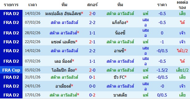 ผลงาน 10 นัดหลังสุดของทีม ลาวาล
