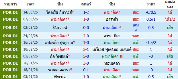 ผลงาน 10 นัดหลังสุดของทีม ฟามาลิเคา