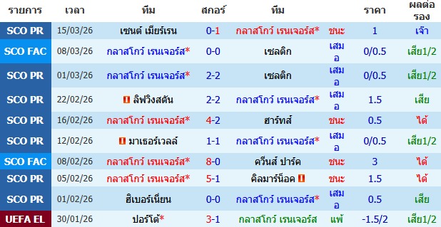ผลงาน 10 นัดหลังสุดของทีม กลาสโกว์ เรนเจอร์ส