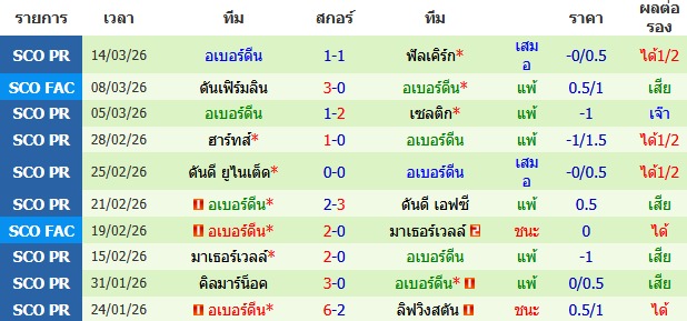 ผลงาน 10 นัดหลังสุดของทีม อเบอร์ดีน