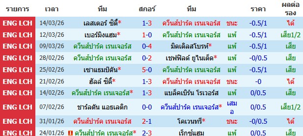 ผลงาน 10 นัดหลังสุดของทีม ควีนส์ปาร์ค เรนเจอร์ส