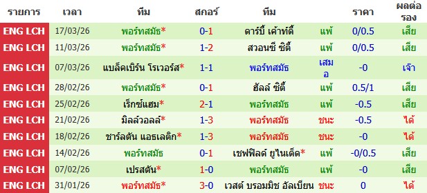 ผลงาน 10 นัดหลังสุดของทีม พอร์ทสมัธ