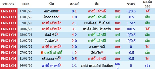 ผลงาน 10 นัดหลังสุดของทีม ดาร์บี้ เค้าท์ตี้