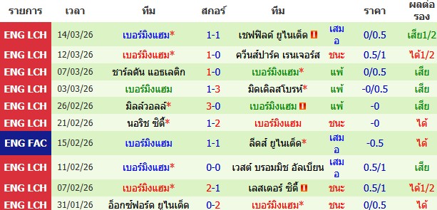 ผลงาน 10 นัดหลังสุดของทีม เบอร์มิงแฮม