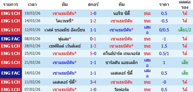 ผลงาน 10 นัดหลังสุดของทีม เซาแธมป์ตัน