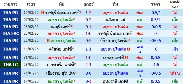 ผลงาน 10 นัดหลังสุดของทีม อยุธยา ยูไนเต็ด