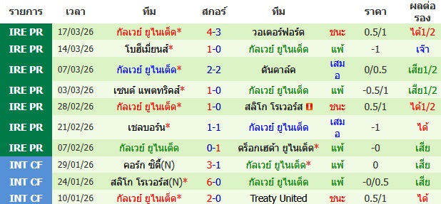 ผลงาน 10 นัดหลังสุดของทีม กัลเวย์ ยูไนเต็ด