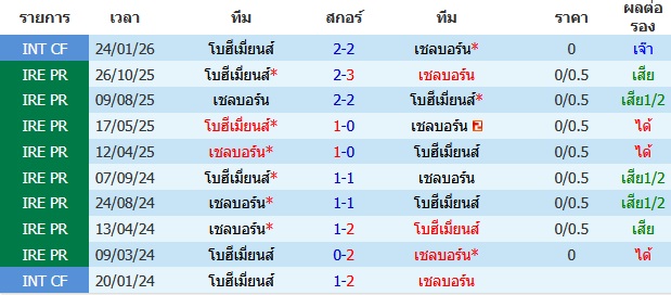 ผลงาน 10 นัดหลังสุดของทีม โบฮีเมี่ยนส์