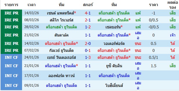 ผลงาน 10 นัดหลังสุดของทีม ดร็อกเฮด้า ยูไนเต็ด